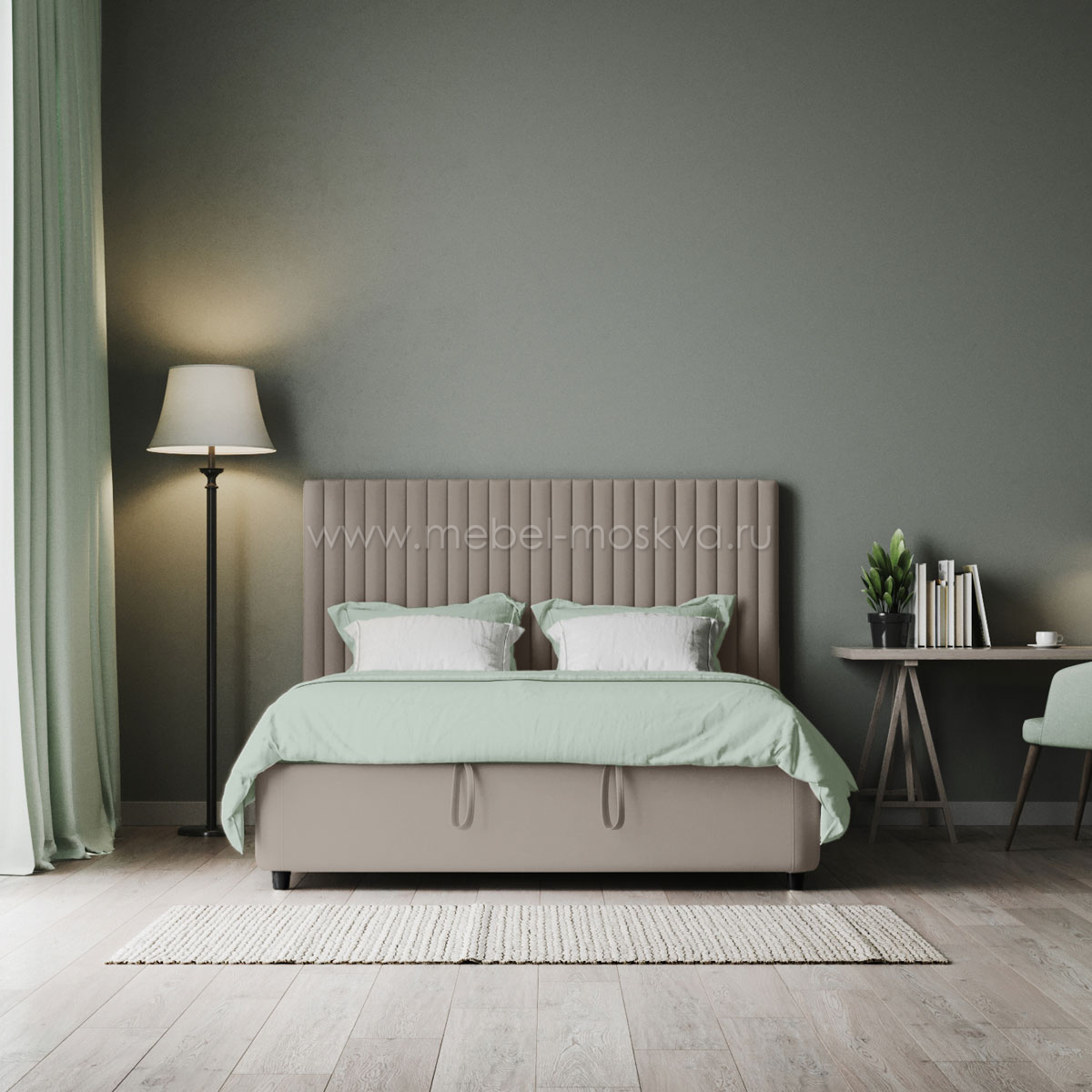 Изголовье кровати оформлено глубокой утяжкой, образующей узоры в виде вертикальных параллельных полос. Такая кровать отлично впишется в большинство современных интерьеров.