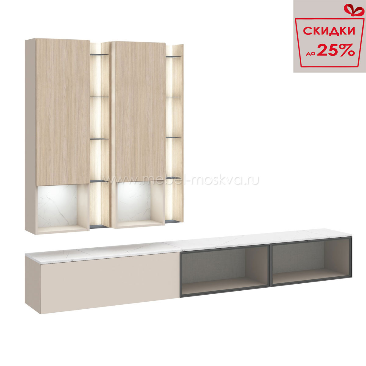 Новинка! Изящный дизайн и практичность — ключевые черты гостиной «Сарино». В состав композиции входят три подвесные тумбы, два подвесных шкафа с фасадами, два узких стеллажа с интегрированной подсветкой.